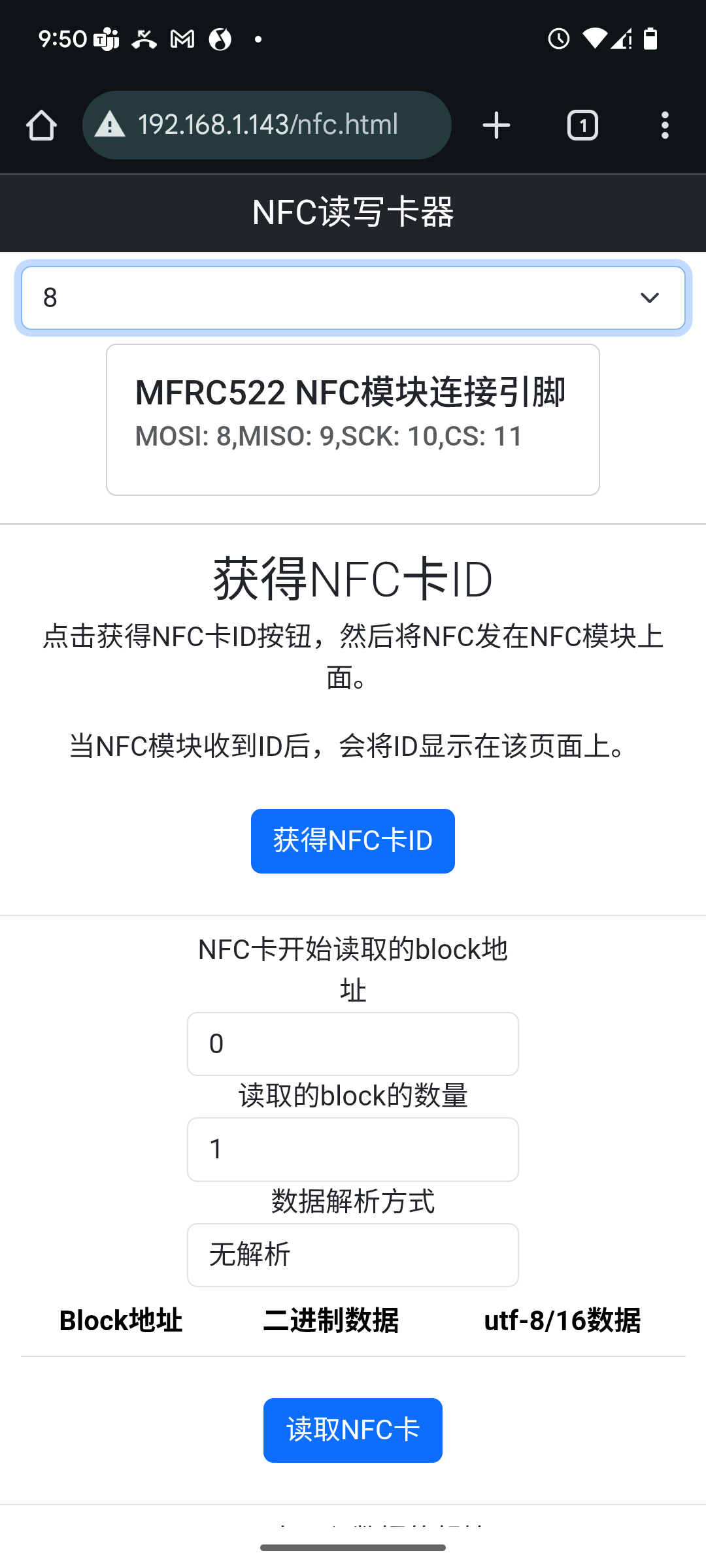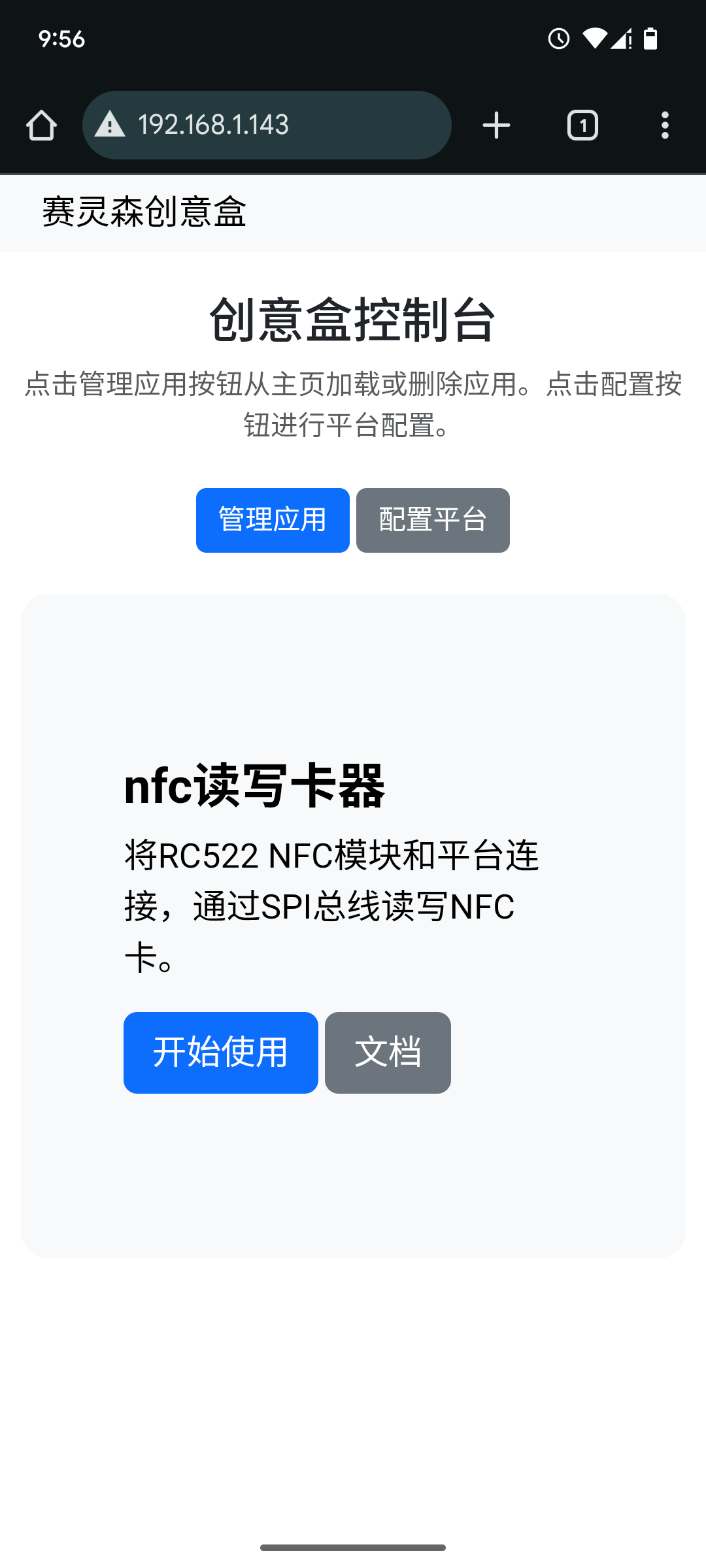打开创意盒控制台,并加载通信类应用中的NFC读卡器应用。进入该应用,选择创意盒与RC522模块MOSI连接的引脚编号。将NFC卡放置于RC522模块上。