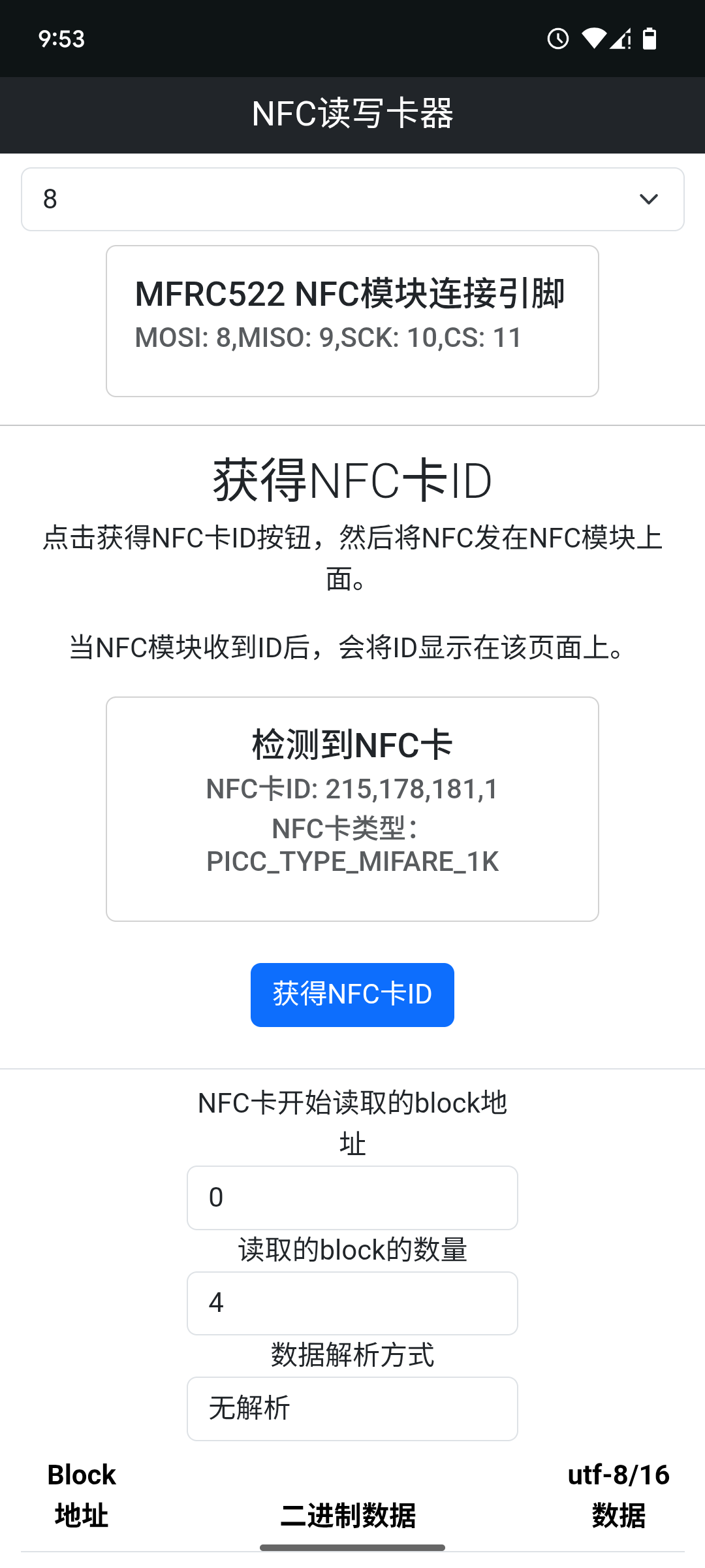 点击获得NFC卡ID按钮,可以显示出该卡的信息。