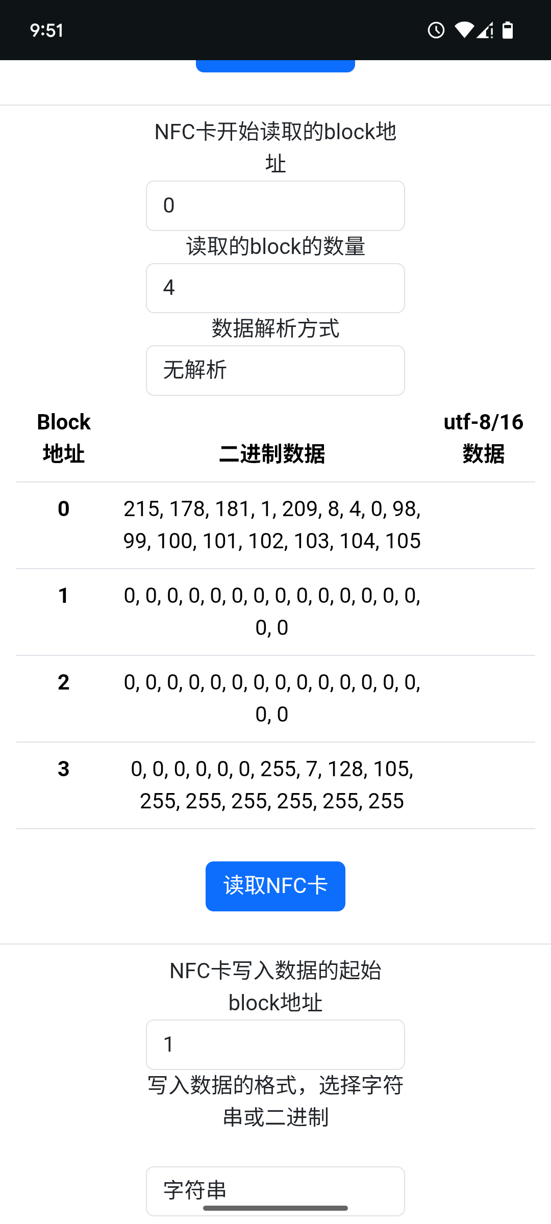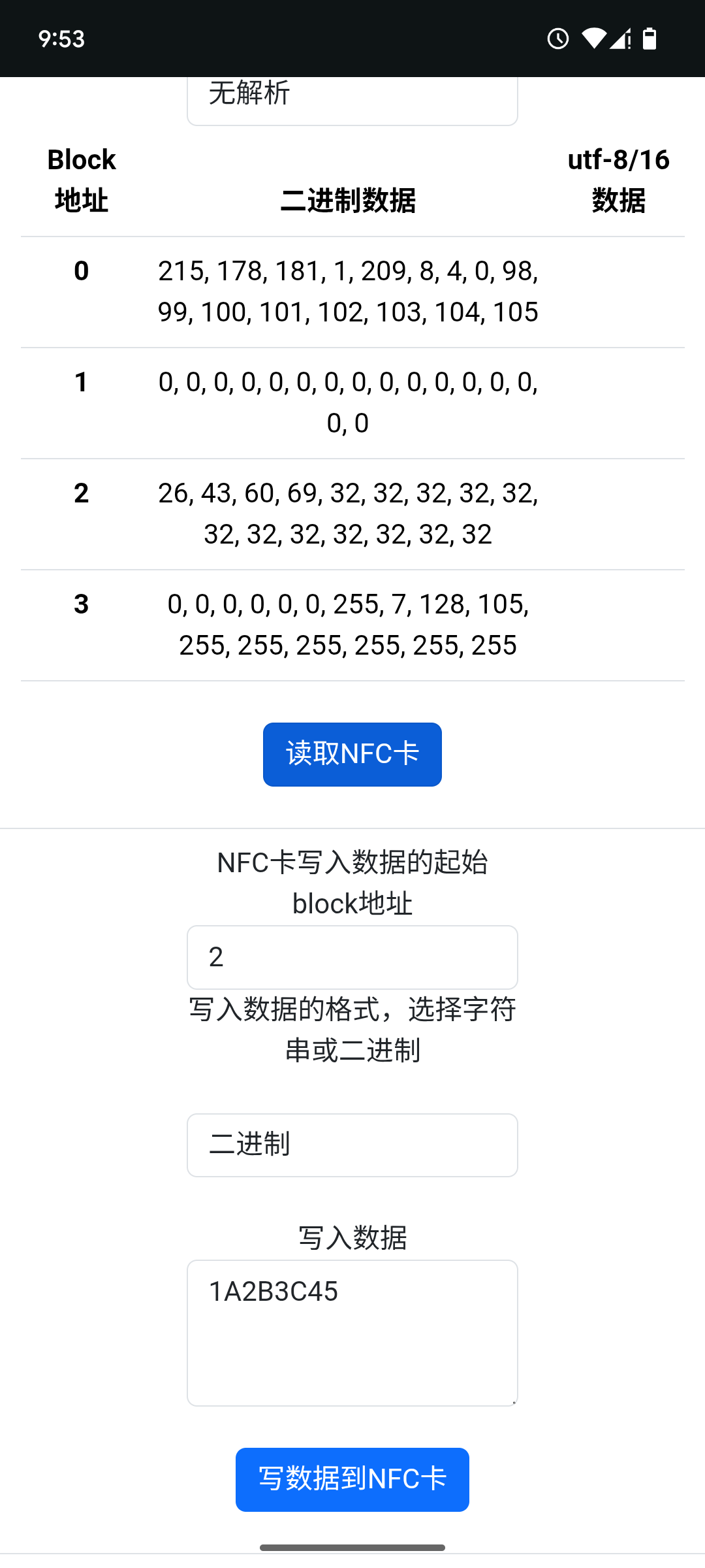 当写数据到NFC卡时,您可以选择写入字符串,或是二进制数据,比如2A2B3D1F。